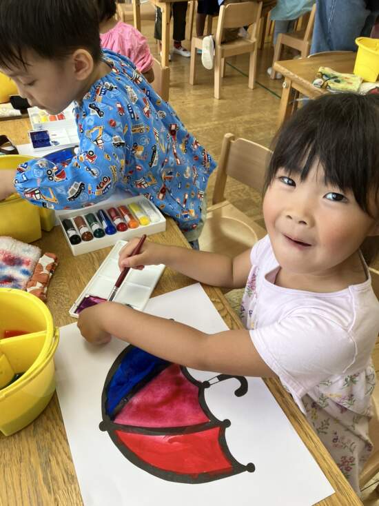 先週の活動では、初めて自分のお道具箱から絵の具セットを持ち出し、色塗りに挑戦した年中さん!