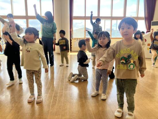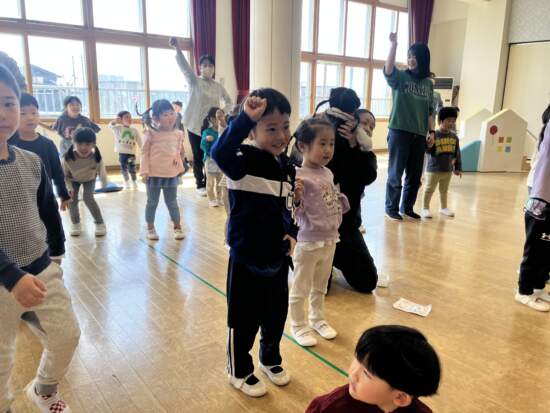 チューリップやダンゴムシ、メダカにツバメになりきっての振り付けに「キャー!」と歓声が上がります。体をのびのびと動かすと気持ちがいいね!
