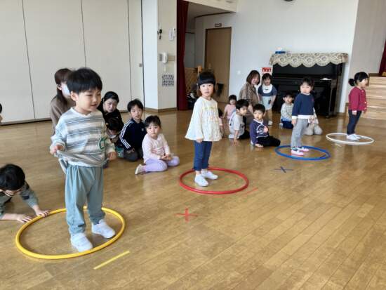 笛の合図でよーいどん!フープからフープへ走って移動します。