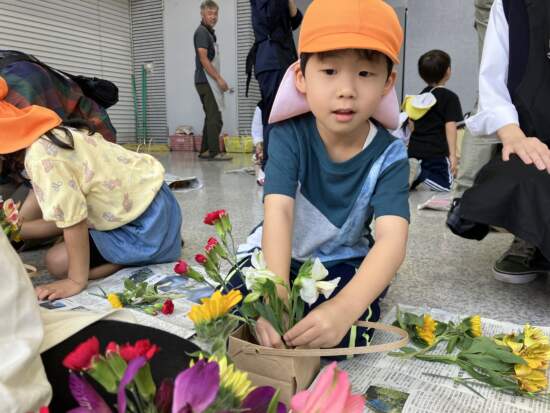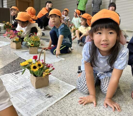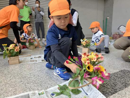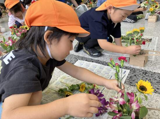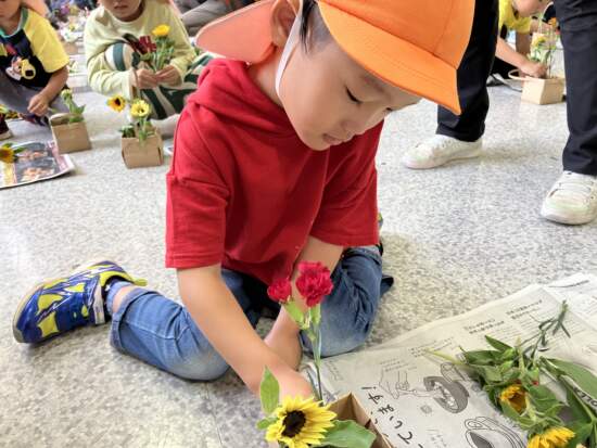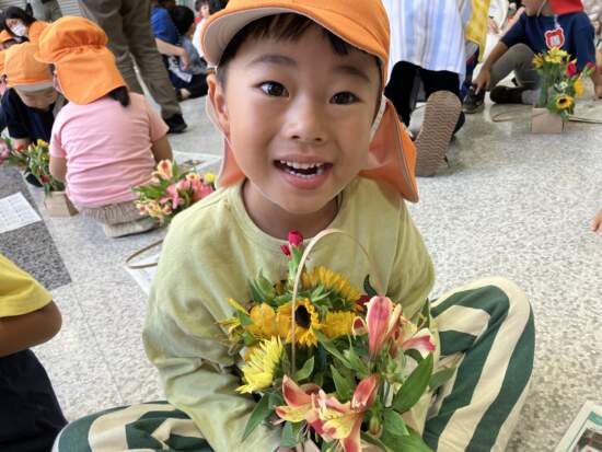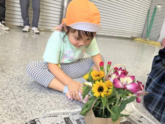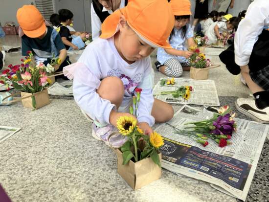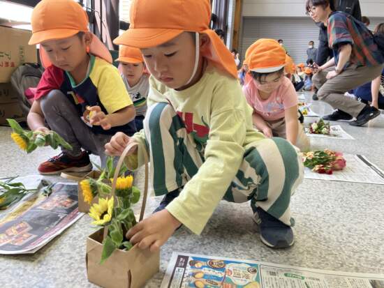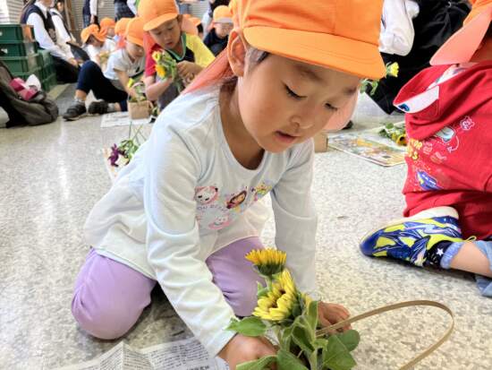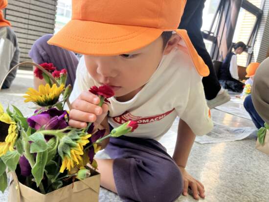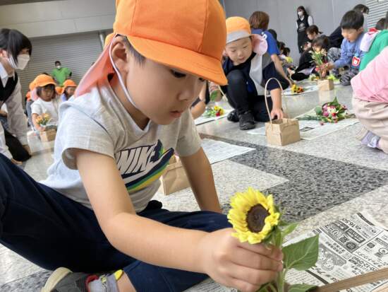 子どもたちの前にはきれいなお花が沢山!「キレイ〜」「ひまわりがあるよ」とワクワクが止まりません。