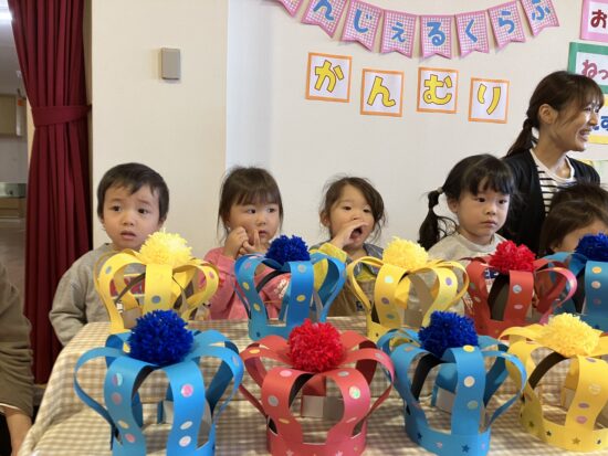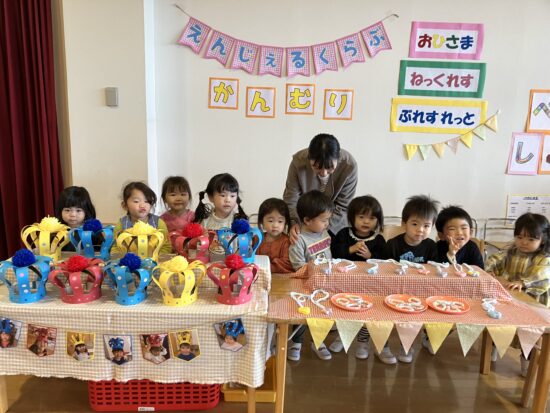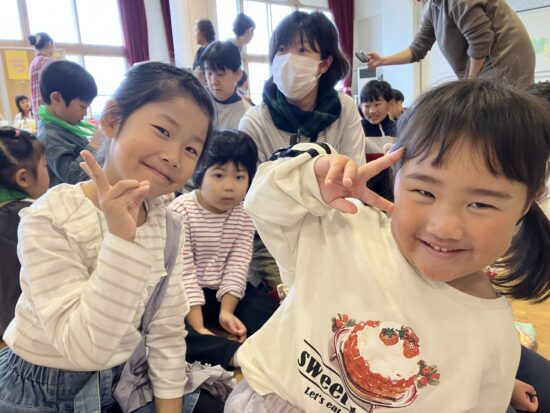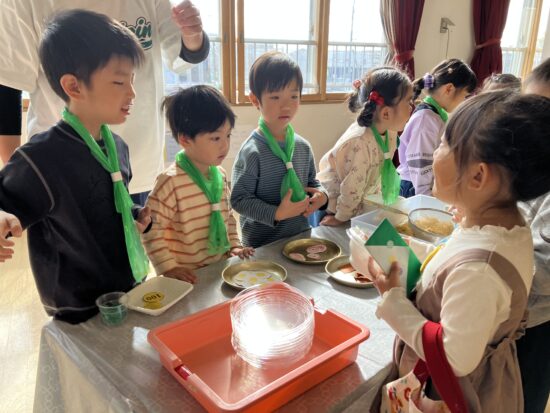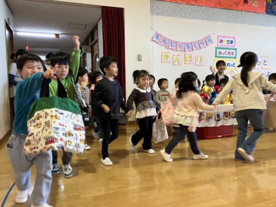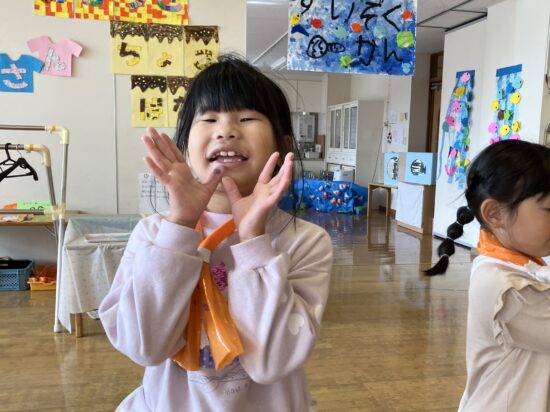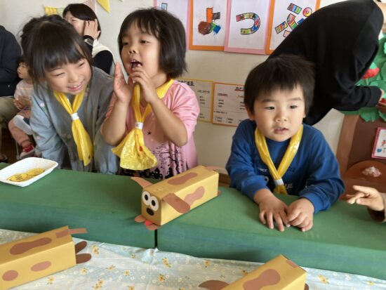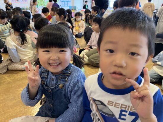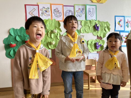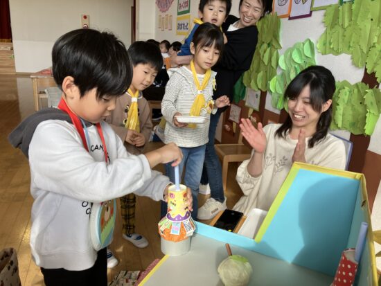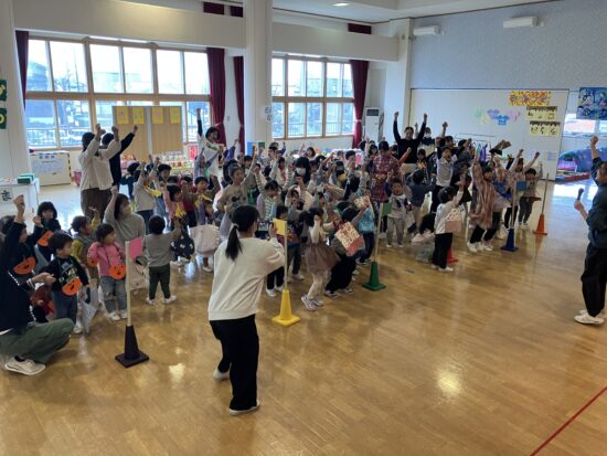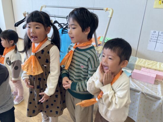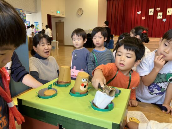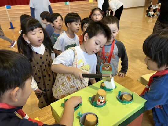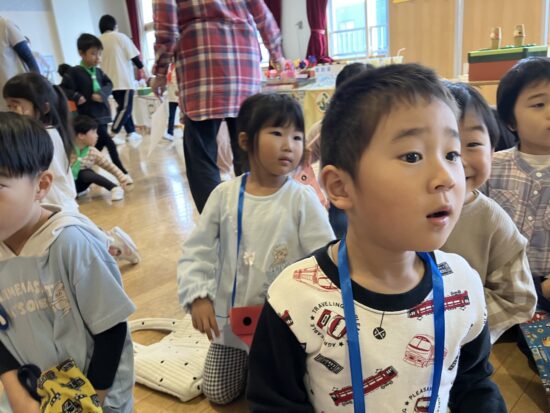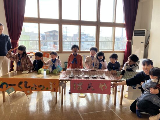 遊戯室に全園児が集まったら、司会の先生のお店紹介を聞き、準備はOK!