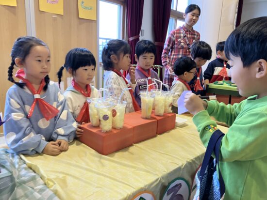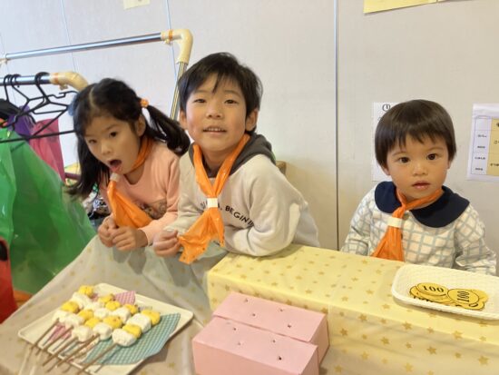 お店番では、呼び込み、お金をもらう、商品を渡す。たくさんのお客さんが来ても一生懸命よく頑張りました!