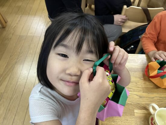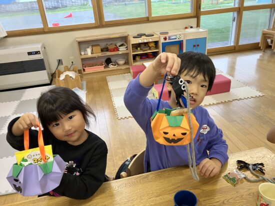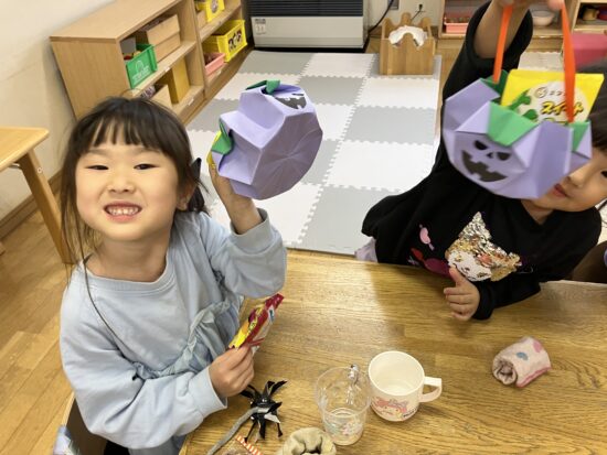 お部屋に戻ってからは、ハロウィン特製のかぼちゃの入れ物におやつを入れてみんなで「いただきます!」