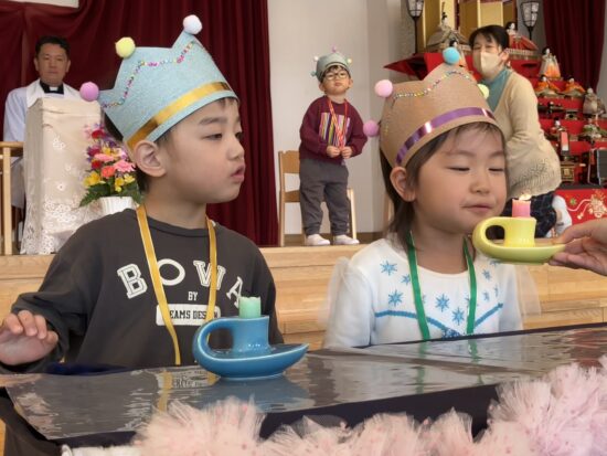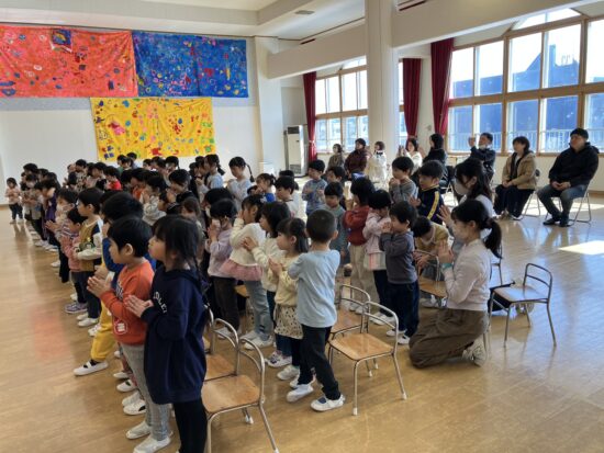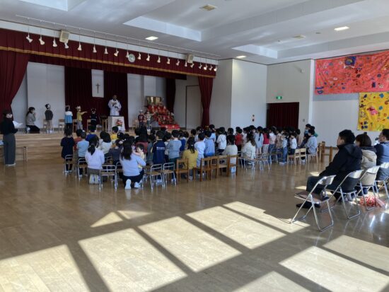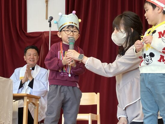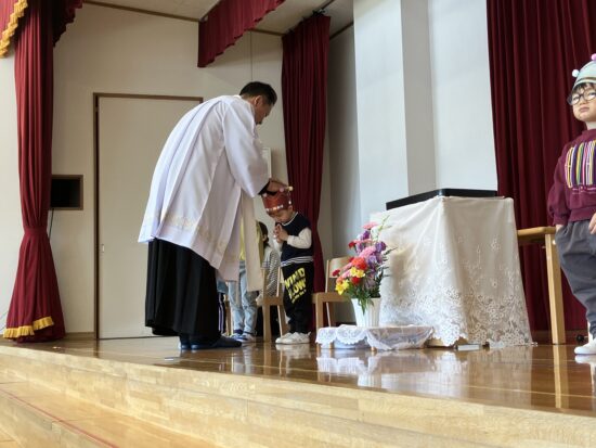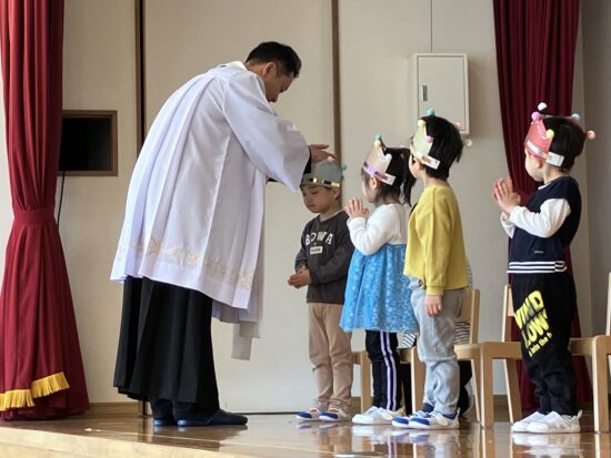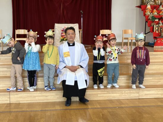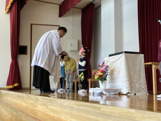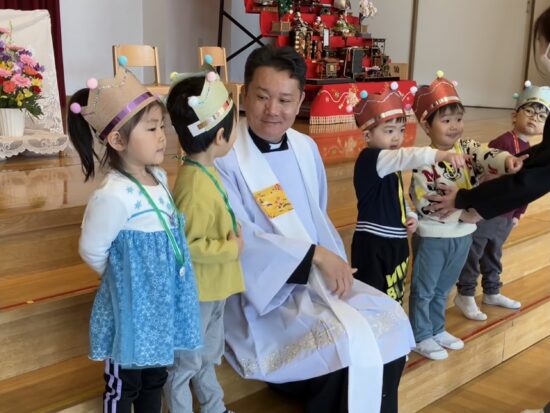 本日まで、2年間天使幼稚園のお誕生会においでくださっていた千葉神父様が、来年度は転勤となり、天使幼稚園には来られないこととなりました。(お誕生会後に、そのようなお話しがありました)