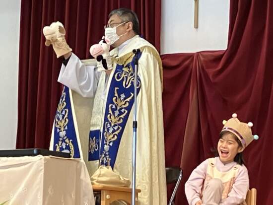 神父様はお友だちのパペット(モウ君とメエ君)を連れてきてくれました。
